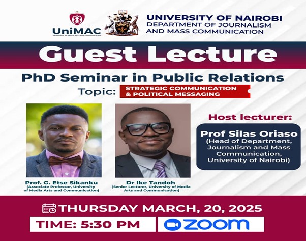 Prof. Sikanku and Prof. Oriaso exchanging Pleasantries The Director of the Directorate of Research, Innovation and Development (DRID) at the University of Media, Arts and Communication (UniMAC) in Ghana, Associate Professor Etse Sikanku, has paid a working visit to the Department of Journalism and Mass Communication at the University of Nairobi in Kenya. This visit...Read More