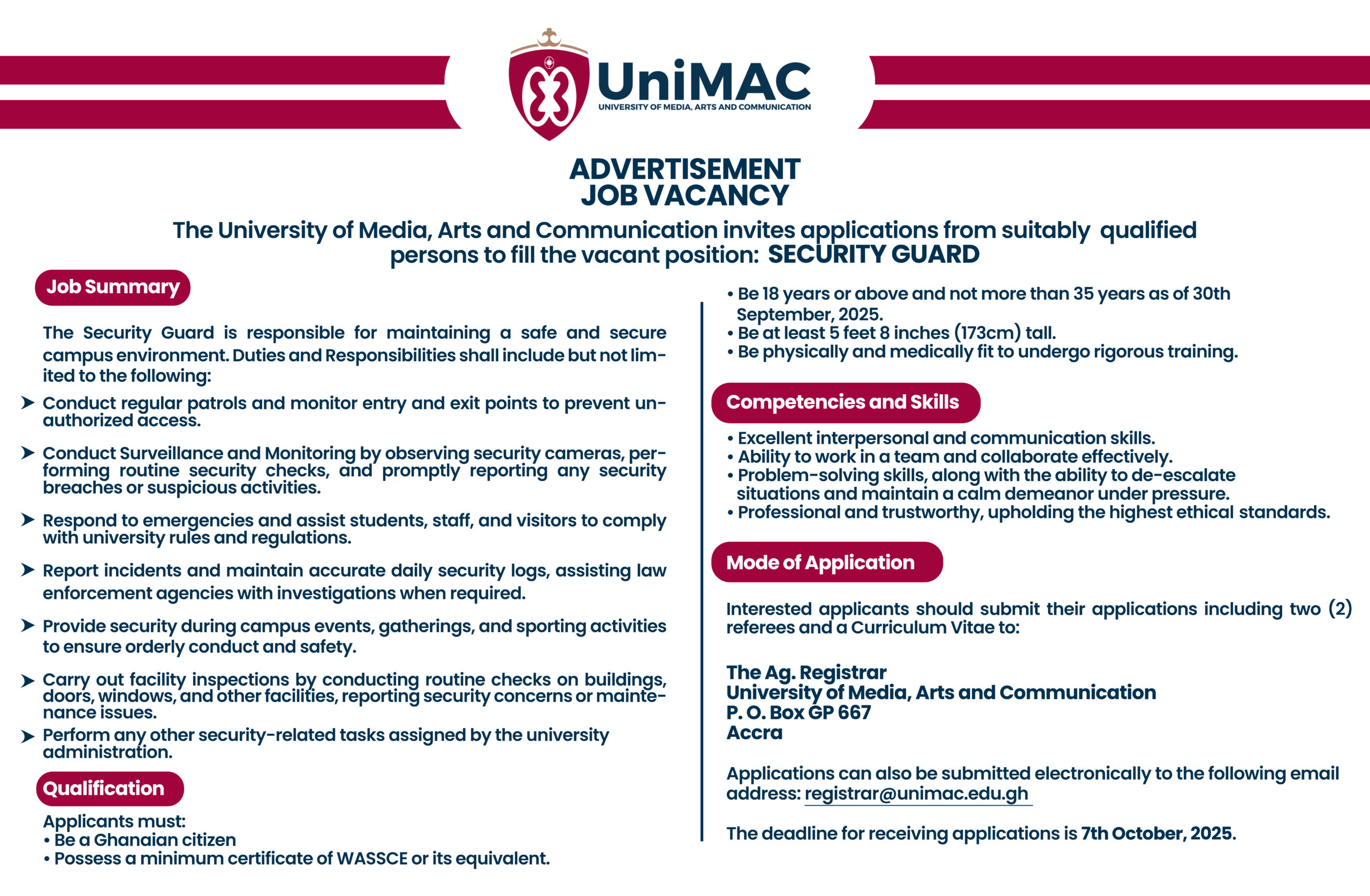 A Group Picture at the End of the Presentation Ceremony  On Tuesday, September 23, 2025, the celebrated filmmaker and Chief Executive Officer (CEO) of Farmhouse Productions, Mr. Ivan Quashigah, donated ten (10) professional tripods to the University of Media, Arts and Communication – Institute of Film and Television (UniMAC-IFT); returning to his alma mater...Read More